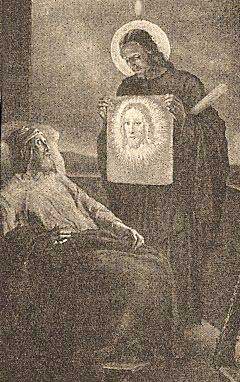 Tradition has it that, among the many he converted to Christianity was the King of Edessa, a city in Mesopotamia, after curing him of leprosy with an image of Jesus that our Lord had pressed on a cloth, as depicted above.
